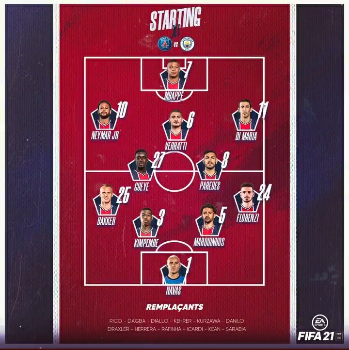 Linha do PSG: Donnarumma; Mukiele, Marquins, Pereira; Hakimi, Verratti, Vitinha, Bernat; Messi, Mbappé e Neymar.