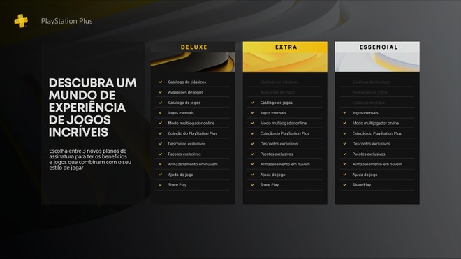 O serviço antigo, que você conhece e com os benefícios usuais, tornou -se o “essencial”. Além dele, a Sony adicionou os níveis extras e deluxe. Extra tem um catálogo recheado com títulos PS4 e PS5. Deluxe reúne os benefícios do anterior e também apresenta jogos clássicos do PS1, PS2 e PSP.