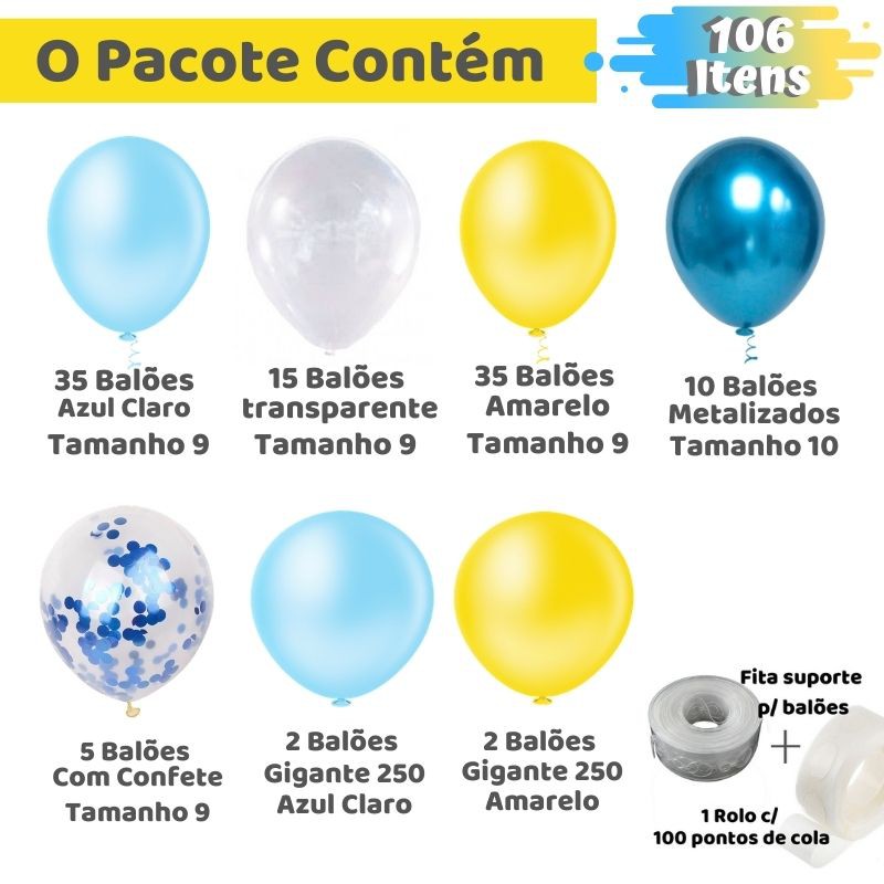 No caso desses produtos, especialmente aqueles cheios de gás de hélio, é recomendável iniciar o processo de enchimento apenas duas horas do evento. Se isso for feito com mais antecedência, o balão murchará durante a festa, comprometendo assim a decoração.200 balões com as cores de sua escolha.